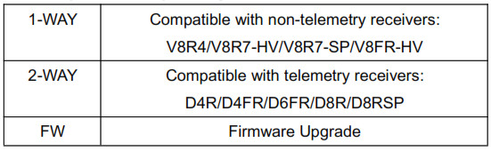 Warning: When working with two-way telemetry receivers (D8R or D6FR), make sure that the battery and servos are plugged into CH1~CH8/CH1~CH6 rather than the side port (A2/Rx), otherwise damage may occur.