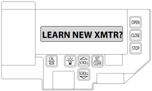 - The display will read “XMTR ___LEARNED.” Where it assigns a random number to the transmitter. That transmitter is entered and ready to operate the door. (Label the transmitter with this number.)