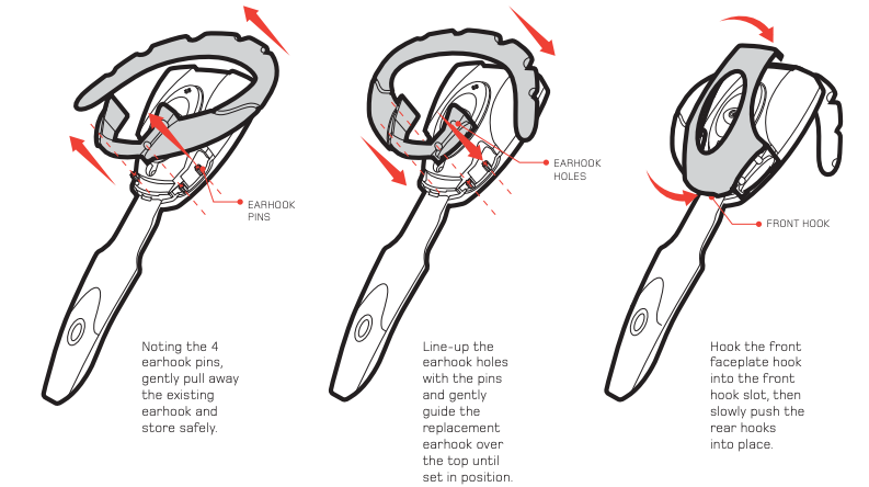 The EX-01 ships with two earhooks, each marked [L] for the left ear and [R] for the right ear. After selecting the appropriate earhook, follow the instructions below: