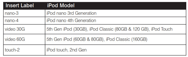 Select the correct insert for your particular iPod model from the chart below: