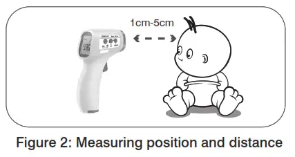 - The thermometer is aligned with the middle of the forehead to measure body temperature (between the eyebrows center it above at the forehead level). Keep the vertical distance, press the On/Scan button, the temperature will display immediately, see Figure 2.