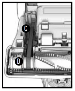 - Ensure that the letters printed on the belt are facing you, slide the new belt over the motor shaft (metal rod) (C). Then slip it around the