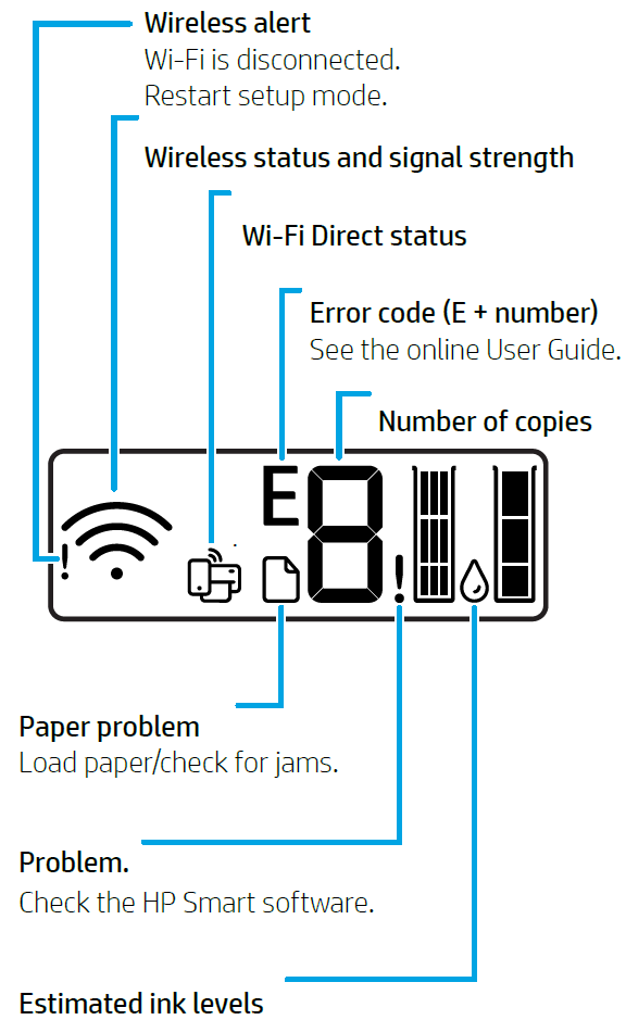 Indicates wireless connection status. Connected when light is solid blue. Blinks when printer is disconnected or in setup mode.