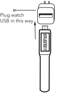 On the side that it is written USB, remove strap by pulling and twisting it a little to one side. Insert the USB side of the fitness tracker into a USB charger or a computer USB port.