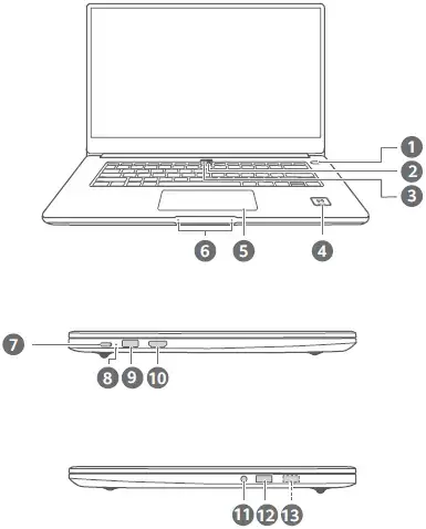 The computer comes with a recessed camera. Press the button shown in the illustration to open the camera and take photos or videos with apps like Camera. Press the button again to hide the camera.