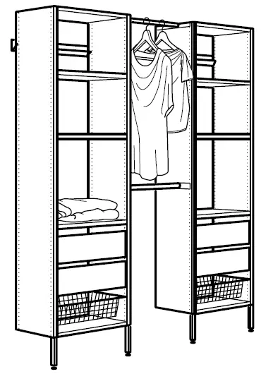 Do you want to have two sections next to each other? Or maybe even more than that? No problem! Since the side panels have holes on both sides it allows you to assemble AURDAL interiors on both sides. For example, if you want to have two AURDAL sections you would only need 3 side panels with legs. - The next step in the planning of your new wardrobe combination is shelves. You always need to place one shelf at the top of one AURDAL section and one at the bottom, this will make your wardrobe both sturdy and functional.