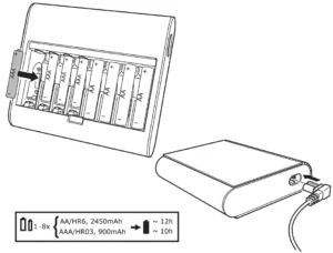 — Charge and store 1 to 8 pieces of HR6/AA and/or 1 to 8 pieces of HR03/AAA rechargeable batteries.
