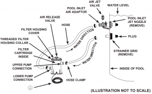 5. Connect the second hose to the pool inlet air adaptor (15) and to the lower pump connection. Make sure all the hose clamps (7) are tight. NOTE: Make sure the air jet valve (14) is securely tighten onto the pool inlet air adaptor (15) and facing up.