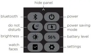 If a feature is colored white that means it’s active/available right now. If an icon is black, it means it isn’t active at the moment. You can tap the toggles you want to interact with (Some toggles are just for display and don’t do anything when tapped on). To hide this panel, simply swipe up on the screen or tap on the small up pointing arrow found on the middle-top of the screen. - Swiping up from the bottom of the main clock face screen will allow you to access your messages/notifications quickly.