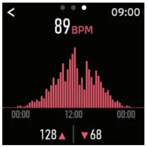 The last screen in the heart rate app on your watch shows a graph of your average heart rate and will show your highest recorded heart rate value and your lowest recorded value.