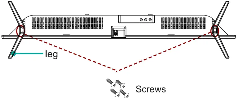 - Place the legs into the bottom slots of the TV, insert and tighten the screws (found in the accessories bag) in the circled areas with the screwdriver (not provided).