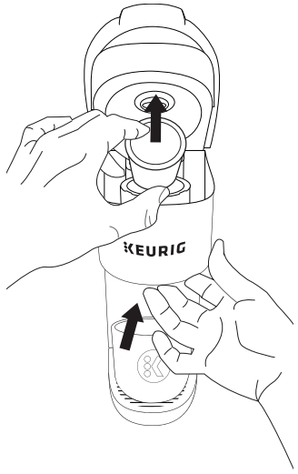 To remove the K-Cup® pod holder from the brewer, lift the handle and grasp the top of the K-Cup® pod holder with one hand while pushing up on the bottom of the K-Cup® pod holder from underneath with the other until it releases. After cleaning, align the K-Cup® pod holder with the opening using the two front ribs as a guide and snap into place from the top.