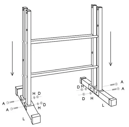 Step 2. Connect the 2pcs parts of step 1 and the base tube (Part L) together, then secure them with bolts, nut and washer (Hardware A,D,H).