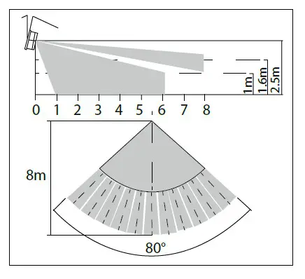 - The reference range template of PIR detection is tested at the indoor temperature (the range is 2025)the target of the test is 77kg±10kg weight and 1.71m±0.3m height, the target of the test across movement speed is 4m/s±0.15m/s.