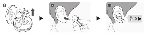 Separate the earbuds from the charging case and adjust them so that they fit comfortably in your ears. When you wear the earbuds, you will hear a wearing detection alarm.