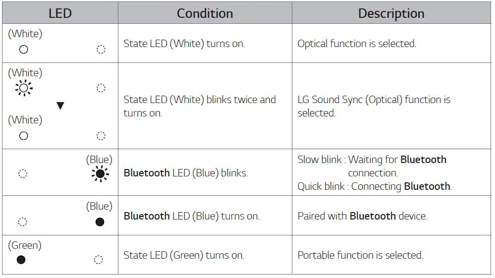 - When this unit reaches maximum volume, State LED (White) and Bluetooth LED (White) turn on for 2 seconds.
