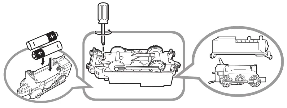 Access the battery compartment by unscrewing and separating the top half of the engine from the bottom half of the engine. Install the batteries as indicated inside the battery compartment. Re-assemble the two halves of the engine, re-insert the screw, and tighten. If the engine begins to operate erratically, you may need to reset the electronics by removing the batteries from the engine and reinstalling them. Requires 2 “AAA” (LR03) batteries. For longer life use only alkaline batteries.