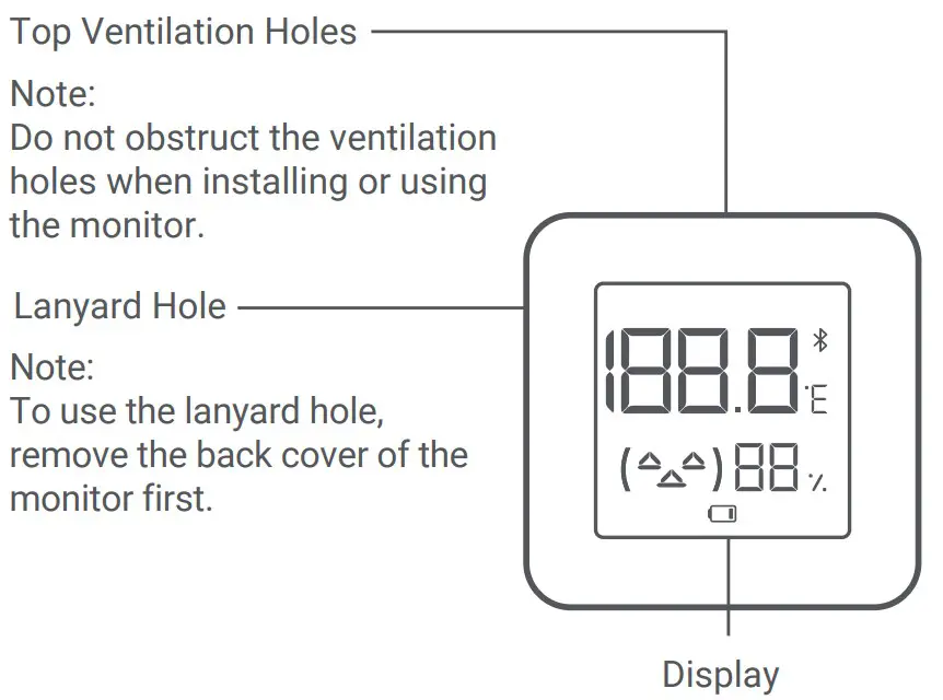 - Hanging: Remove the back cover of the monitor, and lead the lanyard’s loop through the hole and around the hook. Reinstall the back cover, then hang the monitor.