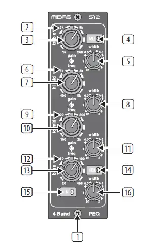 8. Hi mid width control – This knob gives continuous control of the bandwidth from 0.1 to 2 octaves.