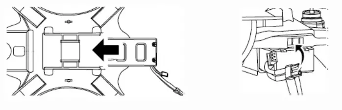 Insert the battery into the battery compartment and make sure the battery is installed in place Then, insert the power plug of the battery into the power socket locating at the rear of the aircraft.