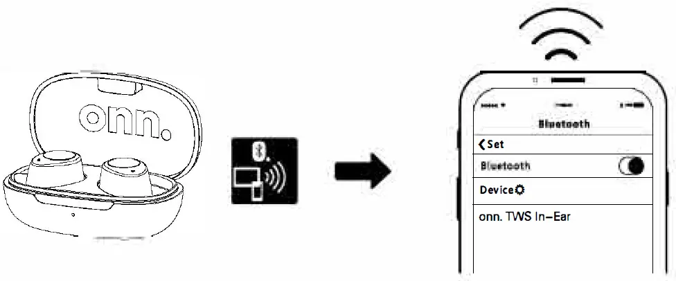 Step 2: Open the charging case, earphones will be powered on and go into pairing mode automatically, connect to your device by selecting “onn. TWS In-Ear”.