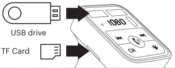 Open your device’s music player and stream music to your device, or insert a USB drive with music. The MP3 audio files will be automatically recognized and the music will play or insert a TF card with music. The MP3 files will be automatically recognized and the music will play.
