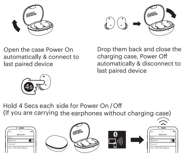 If you want to pair with another device, please turn Bluetooth off on your last paired device if it is nearby, then open the charging case for pairing.