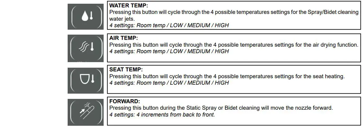 This function will only work if the user is sitting on the toilet. Press the SPRAY/MOVE button for spray cleaning. Water will spray and clean the user. Press the button again and the nozzle will move back & forth to insure the cleanest result. You can use this key stoke to get the best cleaning effect.