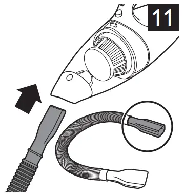 2. Attach the brush tool or the crevice tool to the attachment end of the hose for extended reach during vacuum cleaning (Fig. 12).