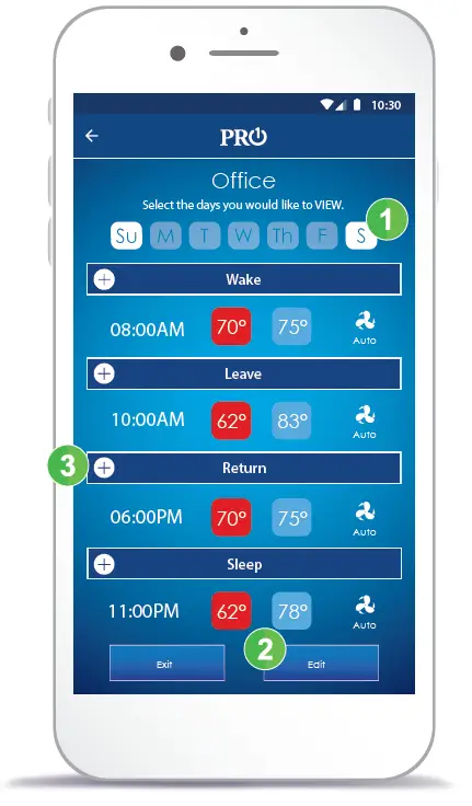View the settings for each time period (Wake, Leave Return, and Sleep). - Exit Scheduling