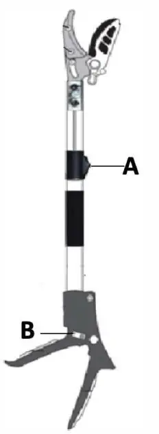 The length of the pruner can be adjusted to allow for a longer reach. To change the length, press the length adjustment button (A} and extend the pruner to the desired length.