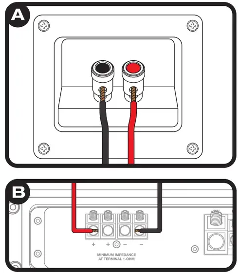 1. Using a 16 gauge speaker wire, connect the negative and positive push terminals of the enclosure (diagram A) to the negative and positive speaker terminals of the amplifier  (diagram B). Make sure to observe correct polarity.
