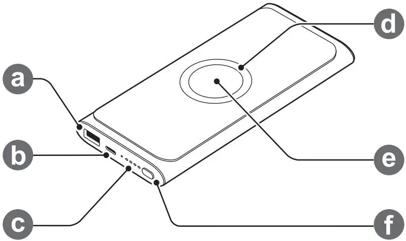 | c | Indicator light | f | Battery level / Wireless charging button |