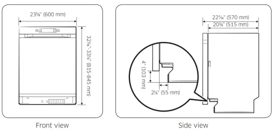 - The location must have sufficient space for the dishwasher door to open easily and provide enough space between the dishwasher and the cabinet sides (at least 0.1 inch/2 mm).