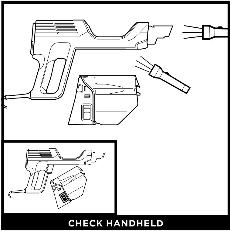 - Check floor nozzle and wand for blockages; clear blockages if required.