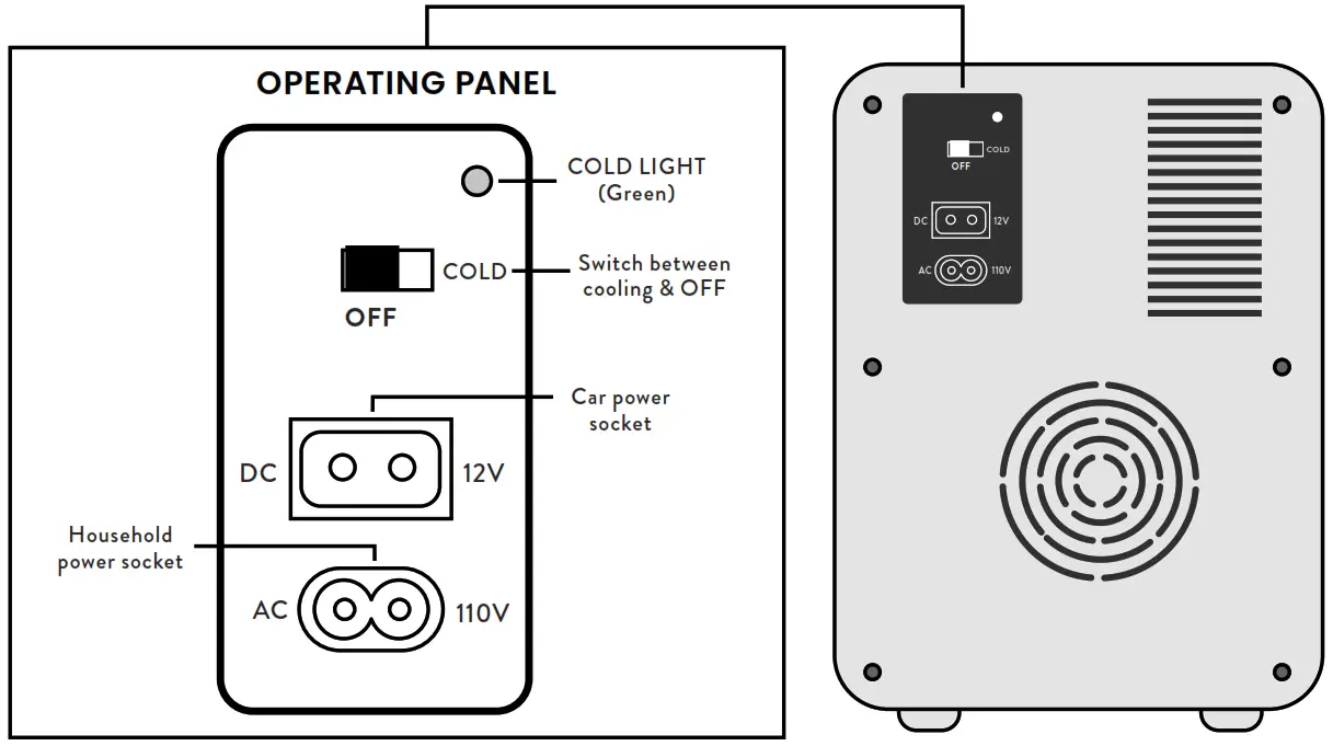 - Connect and insert the plug of the DC power cord into the fridge and the socket of the car lighter.