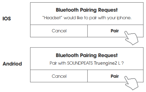 - “SOUNDPEATS Truengine2” will show up on the Bluetooth list, click it to connect. You will hear a voice prompt “connected” from right earbud when the earbuds connect with your device successfully. Then, your device will remind again that “SOUNDPEATS Truengine2 L” request pairing, please click on it to connect.