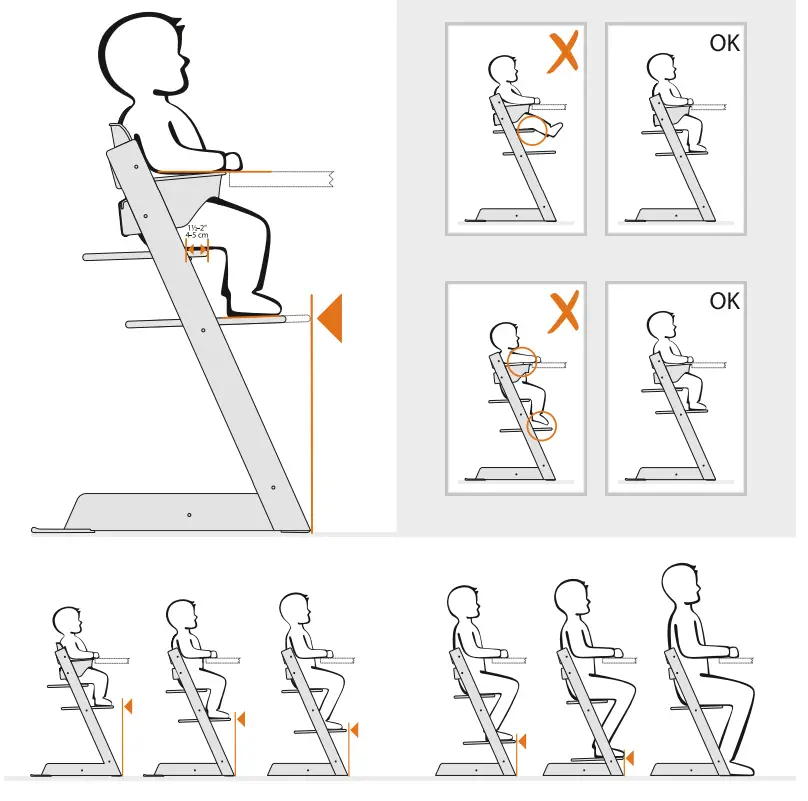 Height – The seat is at the correct height when your child’s elbows are level with the tabletop.