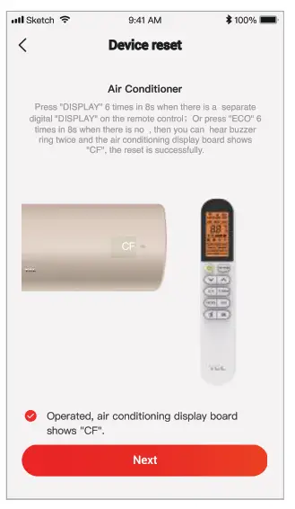 - Start the air conditioner, press 6 times the DISPLAY or ECO button on the air conditioner remote controller within 8s, then you can hear the buzzer ring twice, display board shows “CF”.
