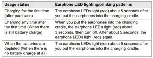 • The way the earphone LEDs light when you put the earphones into the charging cradle depends on the usage status.