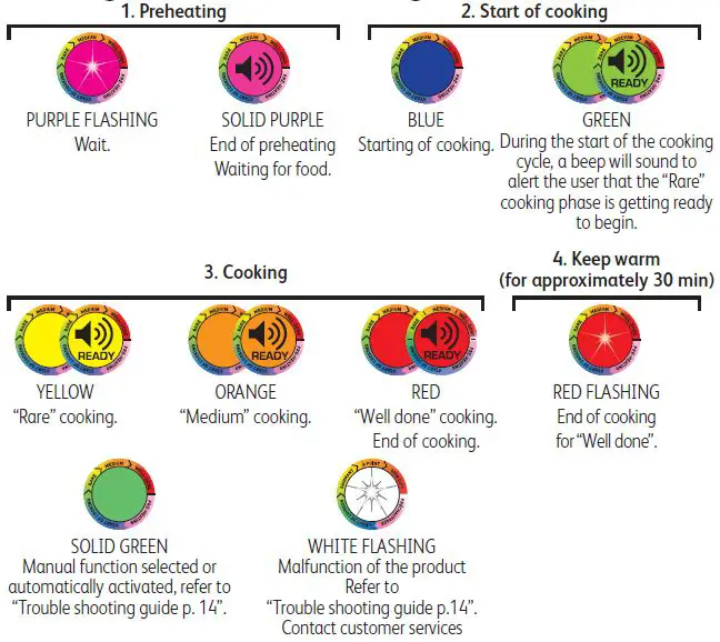 c. When the desired temperature is reached, the grill “beeps” and the colour light indicator becomes fixed. Open the grill, add the food and close the lid. Then the cooking process begins.