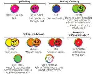 18 According to the degree of cooking, the indicator light changes color. Whenthe indicator light is yellow with a beep, your food is rare, when the indicator light is orange with a beep, your food is medium and when the indicator light is red, your food is well done.