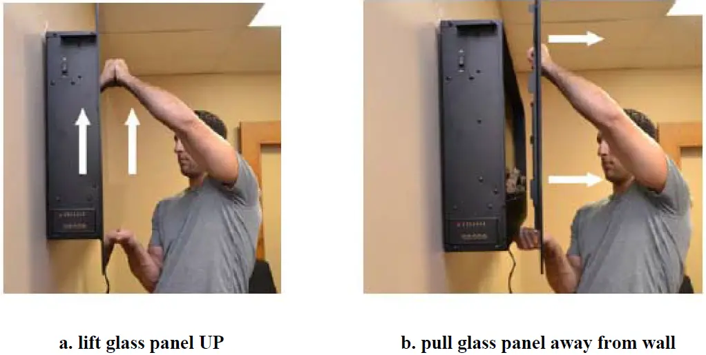 - Carefully, lift and remove the glass panel from the front of the fireplace. The front panel hooks onto the fireplace unit. With 2 people, lift the panel toward the ceiling and then pull the panel out away from the unit. Install replacement glass.