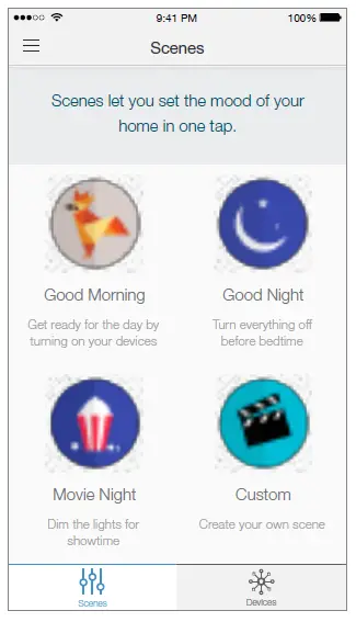 (Scenes) tab to switch to the Scenes view. - Choose one of the preset scenes to start, or choose Custom to set up your own scene that is personalized to suit individual preferences and needs. To set a scene, you will need to select one or more devices to be controlled, and then define their actions and/or states.