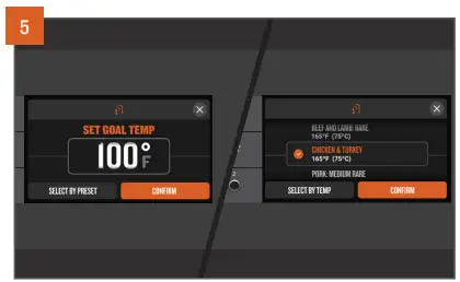 - Use the selection dial to select the desired temperature for your probe goal alarm and press the dial to select and confirm. Can’t remember the safe internal temperature for Chicken Marsala? Tap SELECT BY PRESET to find a list of the food-safe temperatures associated with typical protein choices.