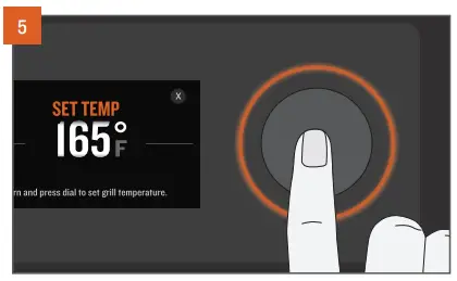 - Once your temperature is selected, you will be prompted to ignite your grill. Press and hold the button on the touch screen display for about 2 seconds until the grill displays that it is successfully “igniting.” The automatic ignition and preheat cycle will begin. The fan and auger will kick on and off throughout the cooking process to stoke the fire according to the set temperature.