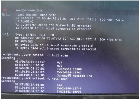 SDIO”, it would be the one of EUT. Replace MAC (such as B8:D5:0B:2E:30:48) and hci number (such as hci1) with the actual ones in the below command and the ping function with BT link would be enabled. while [ -z `pidof l2ping` ]; do sudo l2ping -i hci1 B8:D5:0B:2E:30:48; sleep 3; done