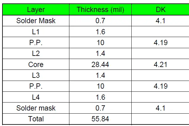 PCB stack (1-2-1) as below: Total Thickness: 55.1mils +/- 10% (1400 um +/- 10%)