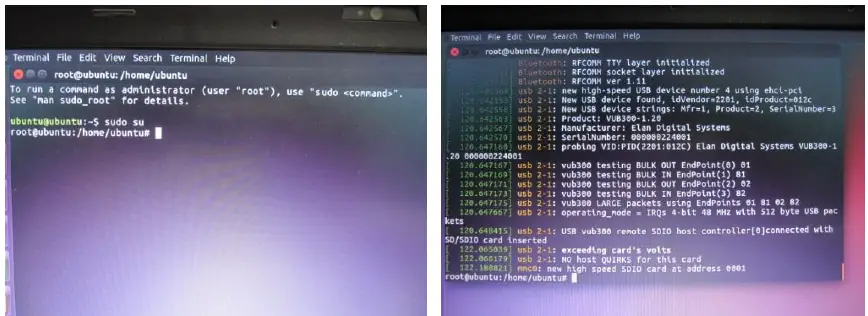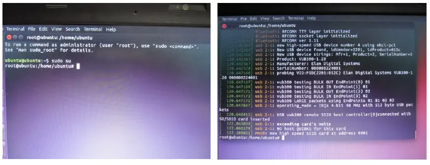 Type “sudo su” on Terminal in Linux to get root authority. EUT could be controlled if “mmc0: new high speed SDIO card at address 0001” is shown after typing “dmesg.”