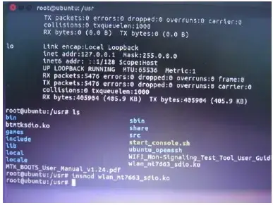 Type “cd /usr” and then “insmod wlan_mt7663_sdio.ko” to enable WiFi function of EUT.
